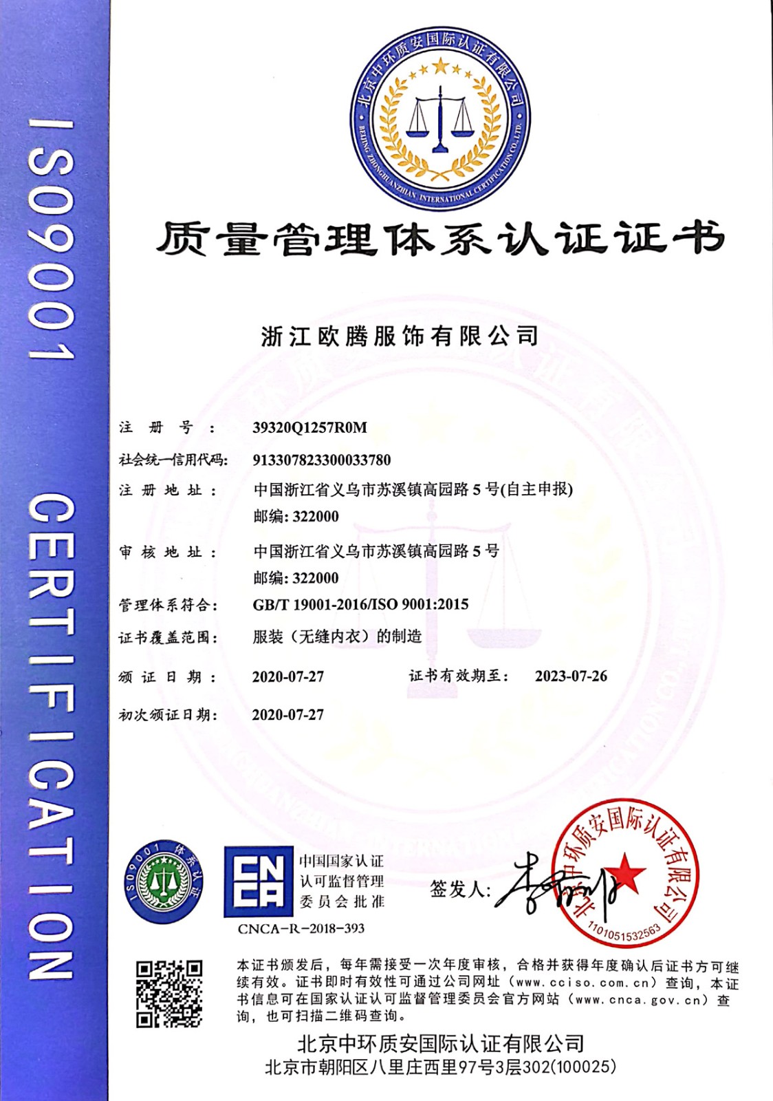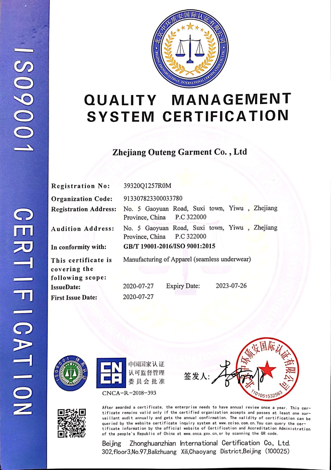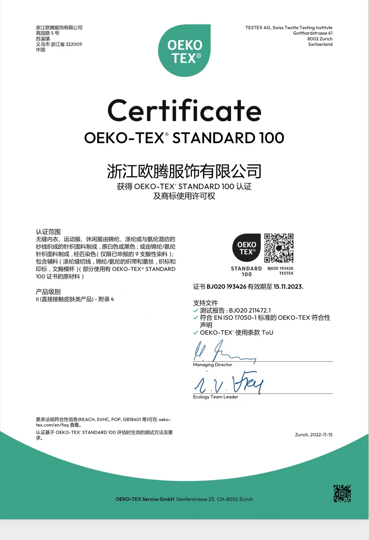 浙江歐騰服飾有限公司位于世界小商品之都-義烏。創立于2015年,是一家專業生產無縫針織運動服飾和內衣的工貿一體企業,擁有自主出口權。 工廠的占地面積約16000平方米 ,引進了大型圣東尼、高騰等多種先進的制衣設備300余臺。月產能可達90萬件。 歐騰服飾每年投入近百萬資金打樣開發(fā)新產品,有著一支高素質設計、技術員工隊伍。工廠先后通過了ISO 9001質量管理體系認證、BSCI認證、GRS認證、OEKO-TEX國際生態(tài)紡織品認證等多項專利檢測報告。可提供OEM&ODM服務。歐騰服飾以一套完整、科學的質量管理體系,生產的服裝從原材料紗線到成衣,質量完全能夠滿足國內、國際質量要求。獲得了客戶一致好評。工廠先后獲得省科技型企業、國家高新企業、義烏市誠信講信用單位、規(guī)上企業、信用AAA級等榮譽。